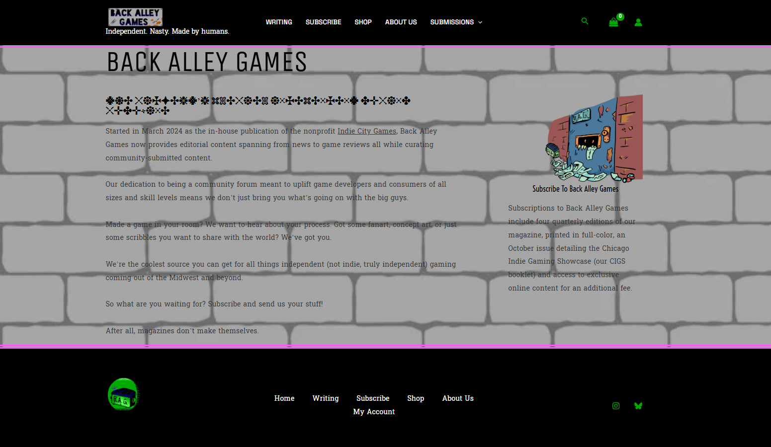 Since January 2025 I have been the managing editor of Back Alley Games, an independent gaming magazine.