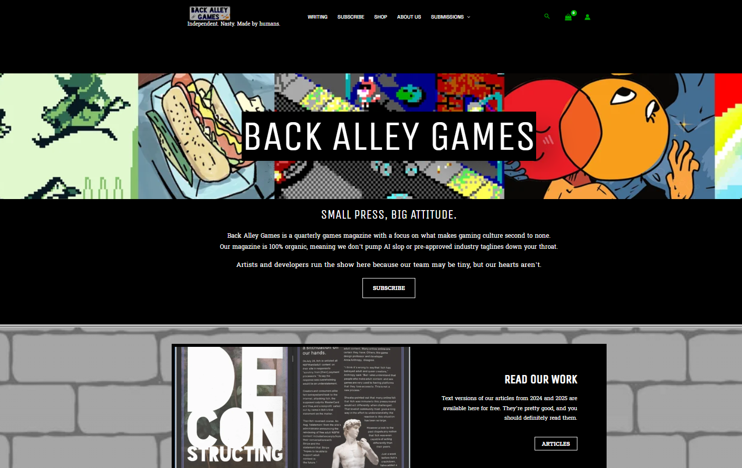 Beginning as a place to direct subscribers to during an in-person event, the Back Alley Games website has, under my direction, transformed into a repository for all the publication’s written content, a tool for gathering and managing subscriptions, and an online store.