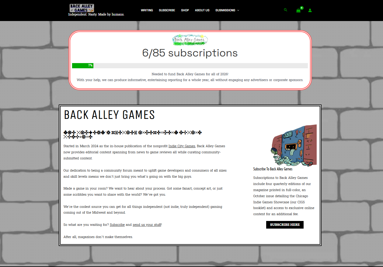 Beginning as a place to direct subscribers to during an in-person event, the Back Alley Games website has, under my direction, transformed into a repository for all the publication’s written content, a tool for gathering and managing subscriptions, and an online store.